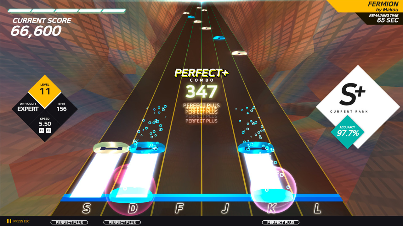 - Выбирай трек и сложность, очищай идущие сверху вниз ноты с идеальными попаданиями.