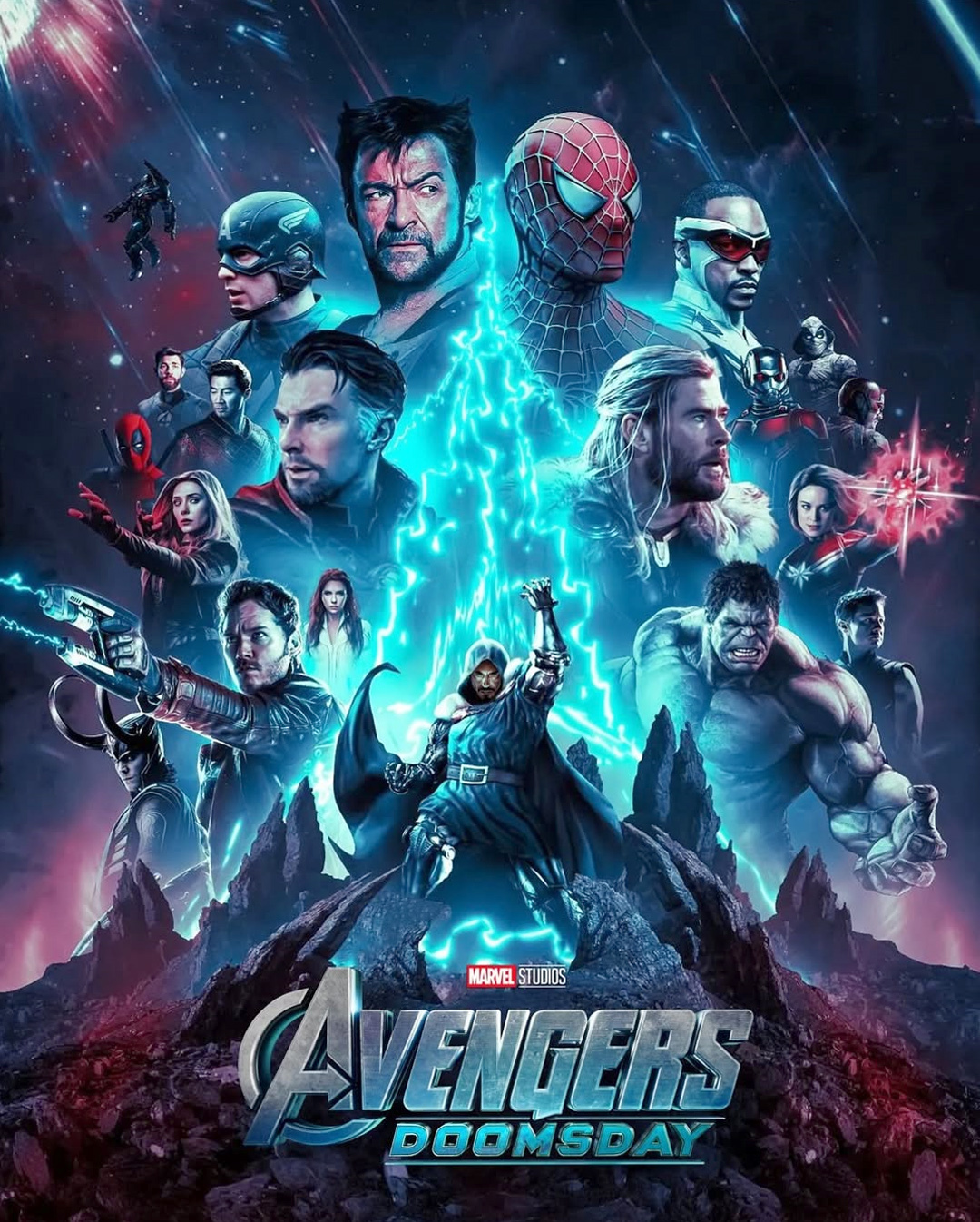 Свежий постер к грядущему командному фильму показал Доктора Дума, а также команду героев, которые будут ему противостоять. На изображении оказались засвечены самые известные супергерои MCU, среди которых Доктор Стрэндж, Тор, Халк, Звездный лорд, Алая Ведьма, Капитан Марвел, Человек-муравей и Локи. Не обошлось и без вернувшихся Капитана Америка (Стив Роджерс) и Наташи Романовой. Кроме того, на постере показали и некоторых неожиданных супергероев, которых в «Мстителях 5» мечтают увидеть зрители. Среди таких оказались Человек-паук Тоби Магуайр (Tobey Maguire), Росомаха Хью Джекман (Hugh Jackman) и герой по имени Уэйд Уилсон.