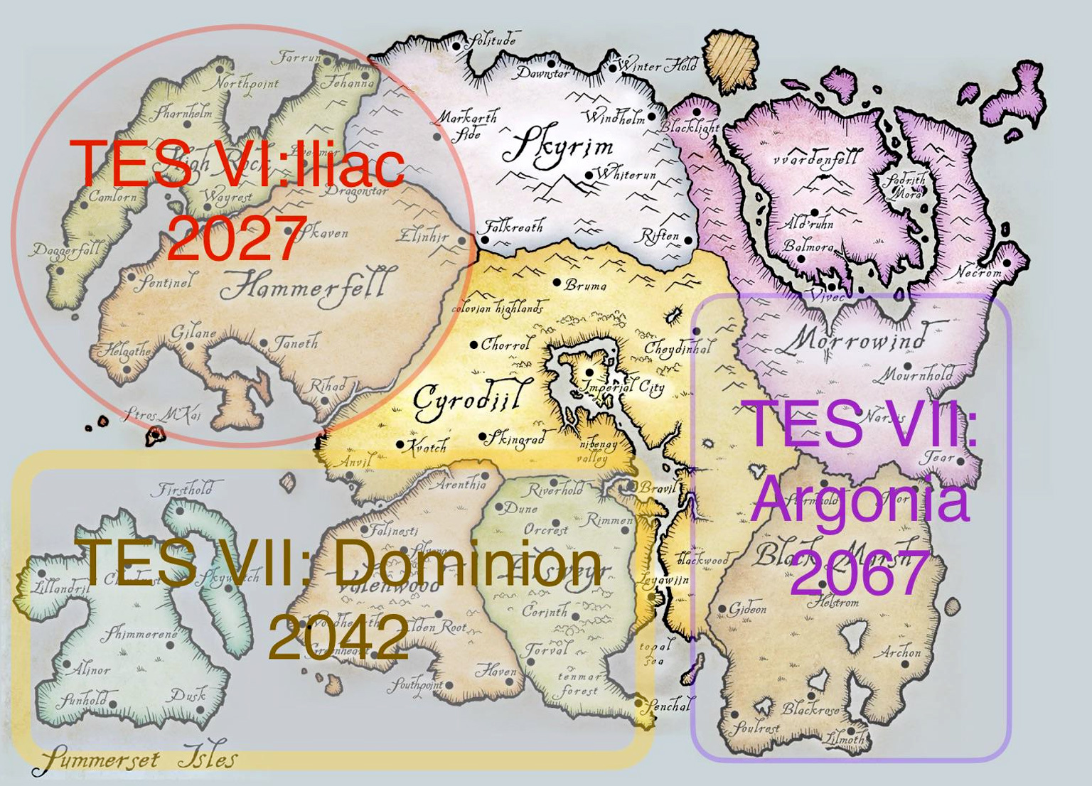 Пользователь Notmitchwilson представил карту мира серии The Elder Scrolls, на которой показал распределение следующих игр по регионам, а также назвал дату выхода. Действие The Elder Scrolls VI, по мнению игрока, должно развернуться в Хаммерфелле и Хай-Роке, что в целом соответствует всем прошлым слухам. Релиз якобы должен состояться в 2027 года. Что касается следующих частей, то здесь пользователь уже проявил больше фантазии. Так, по его домыслам, действие игры The Elder Scrolls 7: Dominion может пройти в Валенвуде, Эльсвейре и на юго-западных островах. При этом события экшена The Elder Scrolls 8: Argonia должны развернуться в Чернотопье и частично Морровинде. Релизы обеих игр, согласно пользователю Notmitchwilson, могут произойти в 2042 и 2067 годах соответственно. «Что вы думаете об этой карте для будущего TES?», — поинтересовался игрок у остальных.