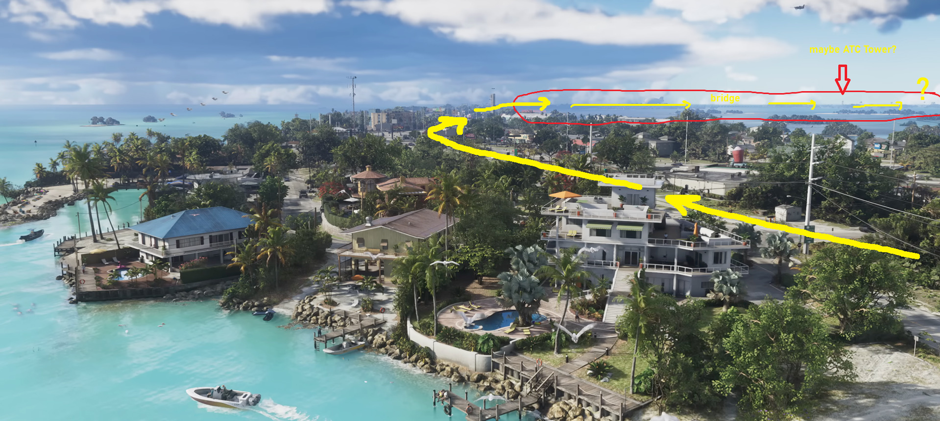 Новым изображением поделился игрок под ником Sengin96. В ожидании новостей по Grand Theft Auto 6 фанат продолжил разглядывать официальные кадры и выяснил, что острова штата Леонида, да и в целом мир игры, могут оказаться даже больше, чем предполагается. Автор выложил скриншот с пометками, а также поделился своими мыслями на этот счет. «Интересно, что у дороги, похоже, нет четкой конечной точки. Вместо того, чтобы явно закончиться, она продолжается, а между тем на горизонте видны едва различимые мосты. Это наводит на мысль, что Ки-Уэст [город на острове] может простираться дальше, чем изображено на большинстве фанатских карт», — говорит Sengin96. Автор уверен, что мир игры GTA VI должен оказаться больше, чем его изображают на фанатских работах. При этом игрок также считает, что масштабы мира будут упираться в производительность консолей Xbox Series S|X.