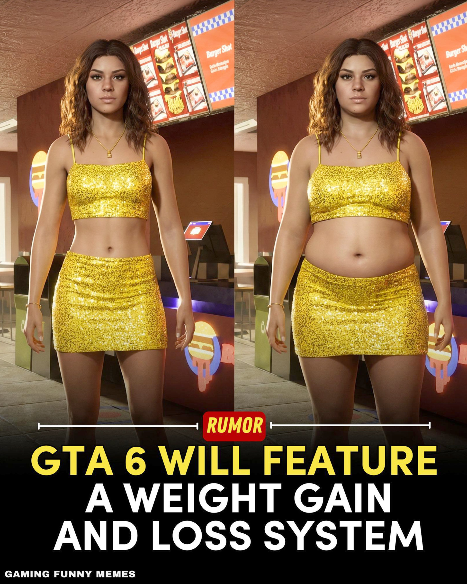 Новыми кадрами поделился игрок под ником sumaira_kanwal82. Он выложил в сеть два изображения, на которых предстала Лусия Каминос — одна из двух главных героев Grand Theft Auto 6. Девушка предстала в желто-серебристой юбке и топике. На одном из кадров Лусия показалась в своем привычном виде, в котором ее привыкли наблюдать игроки. Другое же изображение продемонстрировало героиню поднабравшую значительный вес. Как отметил sumaira_kanwal82, в сети ходит слух о том, что в GTA VI якобы появится система набора и сброса веса, которую можно было видеть в GTA: San Andreas. Игрок решил поинтересоваться у остальных, что они думают на этот счет.